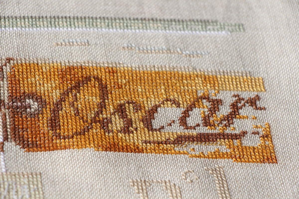 la grille fait au total 192 pts sur 182 pts soit sur cette toile de lin 12 fils "nature de fil" 32 cm x 30.3cm , je brode avec un fil à l'aiguille sur deux fils de trame ( =6 pts/cm)