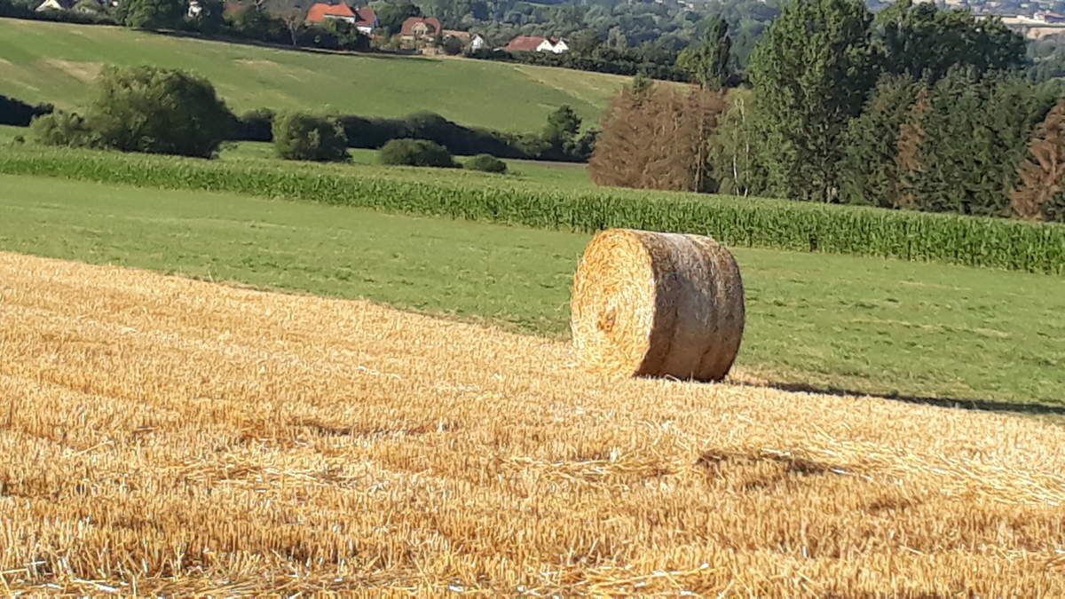 Hier matin en allant me promener j'ai fait quelques photos de mon parcours.. Chaque jour il y a des changements ..là un pré fauché ,ici les blés moissonnés.. Un régal cette nature ..Je fais également de jolies rencontres , un couple de lapins, des chevreuils , même un renard et puis des buses dans le ciel d'autres oiseaux mais là je ne suis pas assez rapide pour dégainer mon portable! les paysages sont bien beaux avec ces bottes de paille
