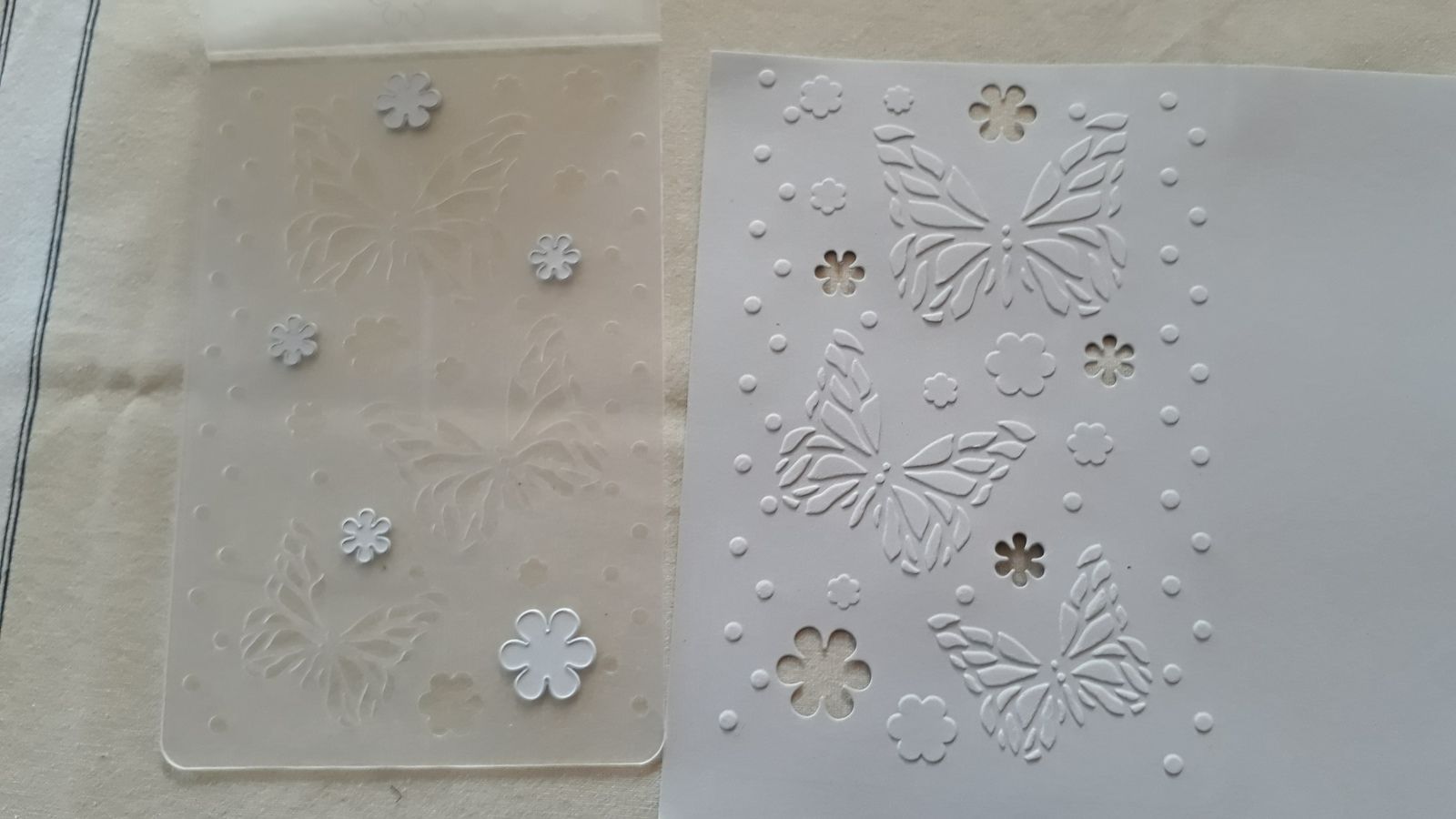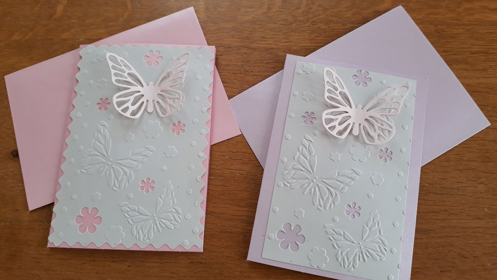 Pour cette occasion j'ai confectionné deux cartes "jumelles" avec une plaque d'embossage papillons de Louise et une découpe papillon de mon stock qui correspondait à un des motifs de cette plaque d'embossage